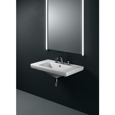 Prédisposition pour robinetterie 3 trous. Y compris porte-serviettes en métal chromé. Ajout possible de la colonne couvre-siphon en céramique.